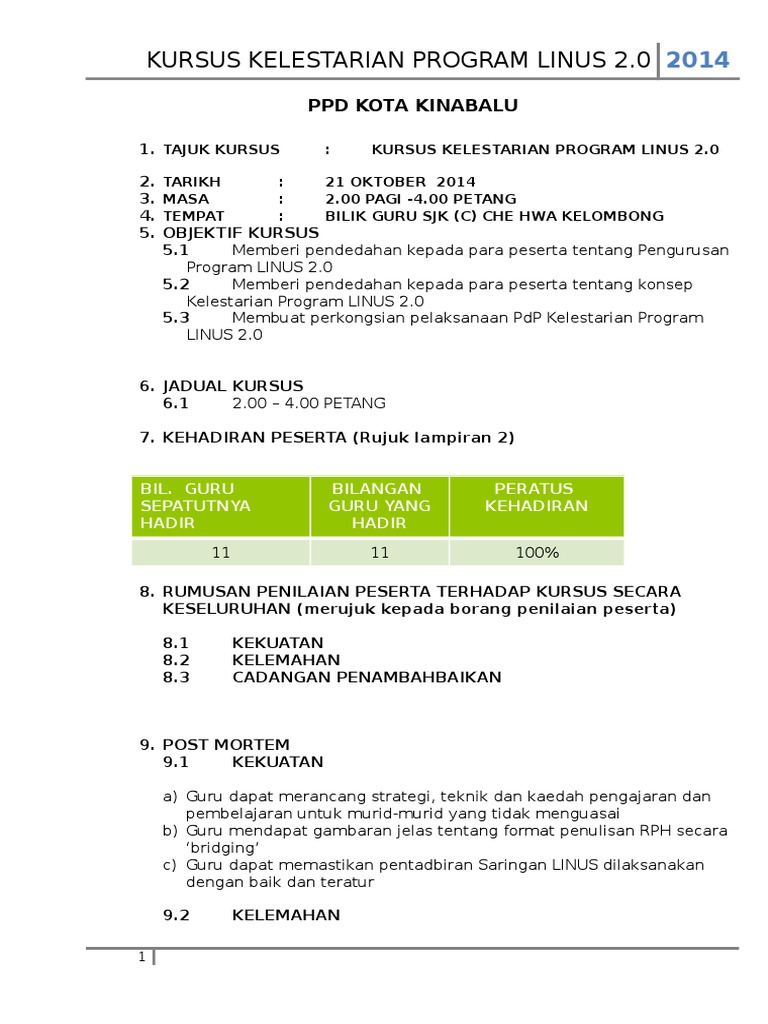 Contoh Format Laporan Kursus Dalaman - Nama mohammad hafiz bin ishak 691003105939 salbiah binti musa 680224106886 suhaimi bin yusoff 710219035791 2 jawatan penolong. Sijil Teknologi Kejuruteraan Bangunan. Memberi peluang kepada warga sekolah terutama para pelajar mengaplikasikan ilmu.